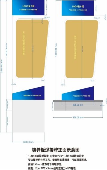 主体上下两处LOGO采用广告级反光膜+UV喷印方式制作,相对于常规户外喷绘工艺,保用时间更长,高温下不容易起泡,且造价经济、性价比高,方便后期老旧更换。主体介绍画面采用50pxPVC+5mm透明亚克力UV背喷的方式制作,在暴晒情况下不易变色、变形。 | ||||||