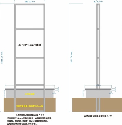 2、预埋及底座砌体:安装现场预埋有管线管道,故采取人工开挖方式进行基坑的开挖,开挖深度为350mm,开挖后地面做水平线垂直找平,将主体结构固定于基坑后内部垫红砖,现场浇筑混凝土固定。草坪上方砌红砖作为大理石底座基础,尺寸:930*135*500mm(长*宽*侧厚)。后期铺贴天然大理石材(芝麻灰色),现场大理石磨边,顶部平面大理石材厚度为36mm。 | ||||||