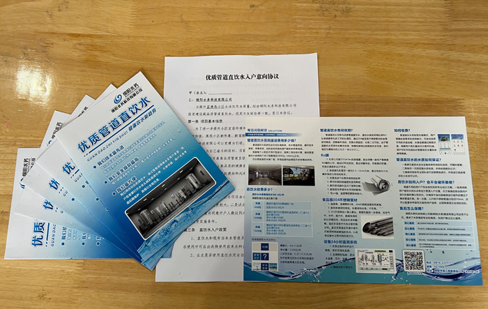 为进一步提升绵阳城区宜居环境和居民健康生活水平,提高饮用水品质,推广管道直饮水业务,树立公司品牌形象。1月中旬,绵阳水务科技有限公司工作人员正式入驻蓝澳岛小区,开展“城区直饮水进万家”宣传和用户意向调查签约活动。