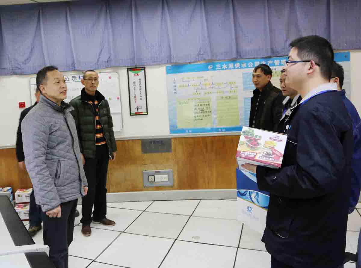 欧飞跃带领第一慰问小组,先后深入三水厂、御营二号井、集团公司食堂、城市供水公司、供水调度中心、供水服务热线、塘讯污水处理厂等处看望慰问坚守在工作岗位的值班职工。在三水厂中控室,欧飞跃对值班人员说:“今天是大年夜,本应该是万家团圆的时刻,但我们承担着城市供水的重任,我们必须要坚守在工作岗位上。过年了,我们代表公司党政工来看望大家,祝愿你们及家人吉祥安康!生活幸福!同时,希望你们继续坚守岗位,认真履行值班制度,确保城市供水安全、正常。”每到一处,欧飞跃都要仔细地询问生产情况及值班安排情况,对岗位上的同志送去新年的祝福,也提出具体的要求。坚守一线岗位上的干部职工也被公司领导们舍小家顾大家、心中惦念着职工的浓浓情意所感动,大家均表示:一定要坚守岗位、安全生产,保障千家万户用水正常,让大家过一个美好、祥和的春节!