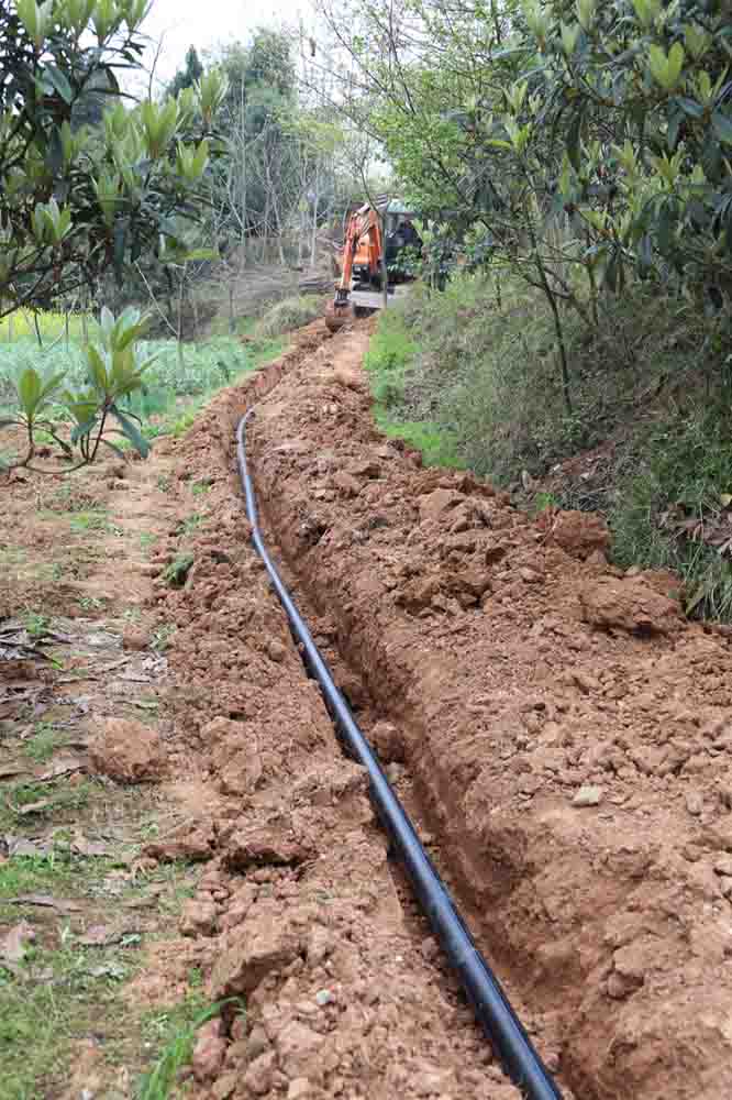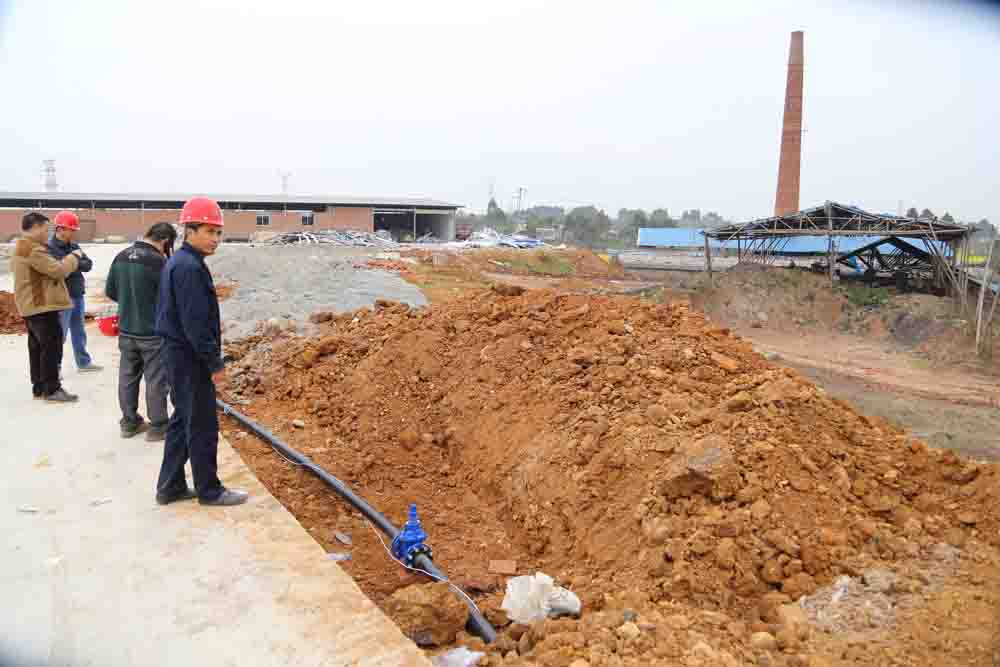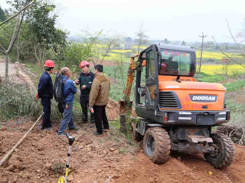 3月20日, 5个施工班组全面进场施工。由于施工地距乡镇较远,必经之路全是土路,许多道路车辆不能通行,运送材料只能依靠人力,不利的施工环境给施工带来了许多的困难。面对工期紧、施工战线长等不利因素,为保障施工质量和进度,工程负责人周启照、张学东,质安员张卫东及各施工班组负责人均值守在现场,在5000余米的施工战线上来回巡视和指挥,牢抓施工安全质量和进度。