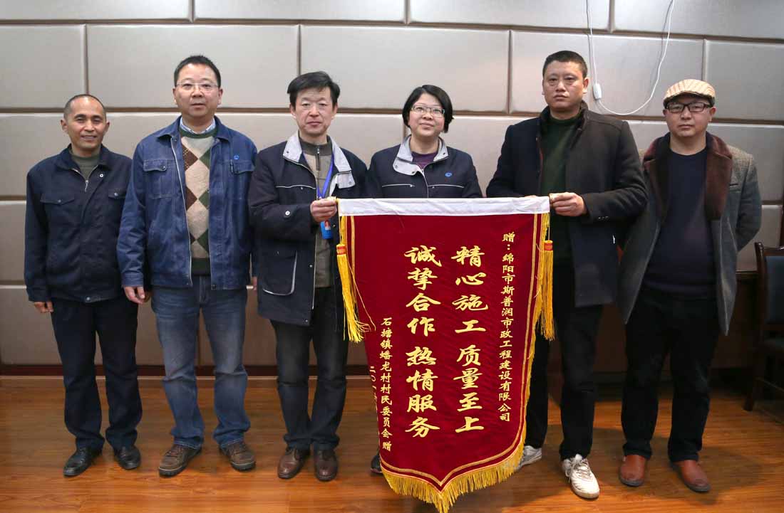 近日,石塘镇蟠龙村村民委员会代表携一面刻有“精心施工 质量至上 诚挚合作 热情服务”十六字的锦旗,送入了绵阳市斯普润市政工程建设有限公司,以感谢斯普润公司在实施石塘镇蟠龙村新建户表工程中的优质高效、服务周到及优质施工。斯普润公司总经理刘萍、总工程师韩青、支部书记、工会主席谢涛及工程技术部代表接收锦旗。