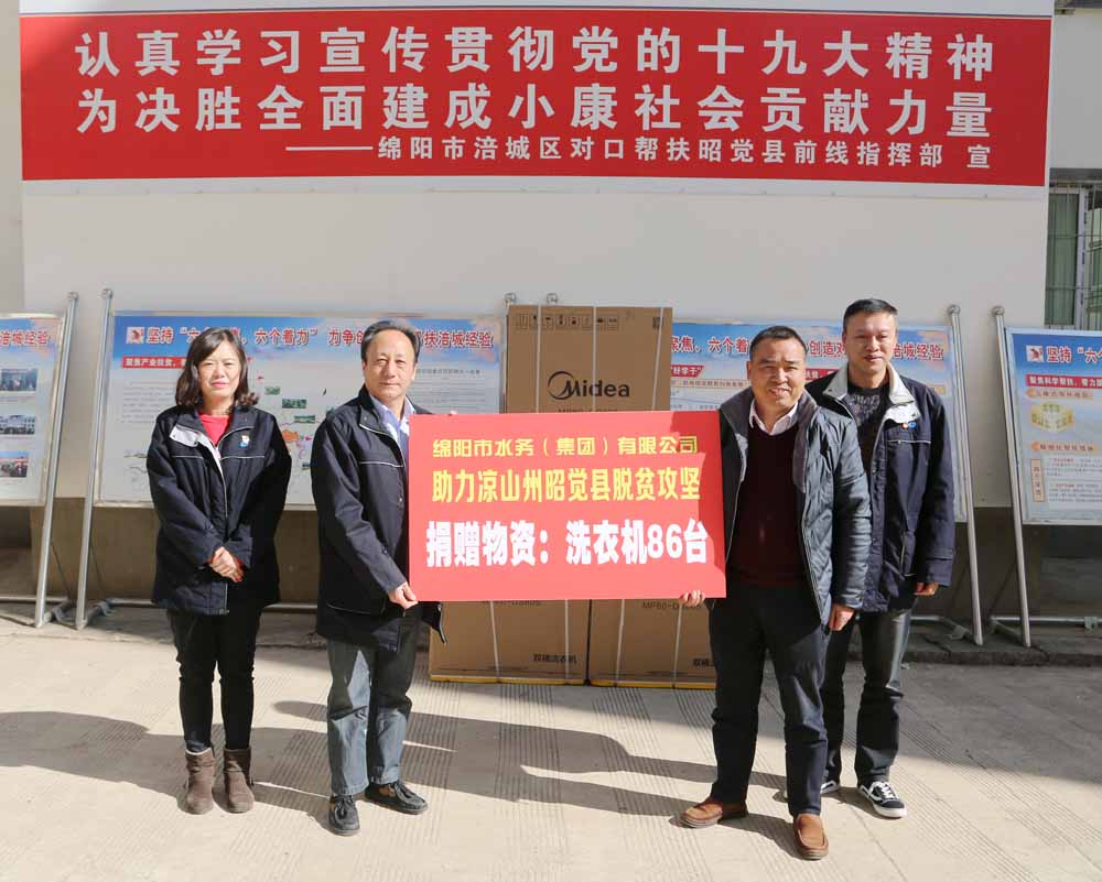 12月10日,集团公司帮扶昭觉县物资捐赠仪式在涪城区对口帮扶昭觉县前线指挥部举行。根据当地帮扶脱贫需要,集团公司党委、董事会着眼帮扶“短板”,聚焦“精准”要求,向昭觉县三个贫困村捐赠洗衣机86台,帮助当地贫困群众改变生活习惯,提高生活质量,助力脱贫攻坚。