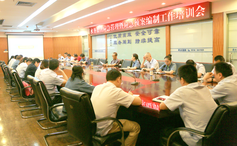 为深入学习贯彻《四川省生产安全事故应急预案管理实施细则》,进一步规范集团公司突发事件应急预案管理工作,提高各级管理人员应对和处置各类突发事件的能力,5月23日下午,集团公司组织召开了应急管理暨应急预案编制工作培训会。集团公司党委委员、副总经理、安委会副主任郑旻主持会议并讲话;安全与保卫部经理车耿岩做了主题培训。生产运行管理部、水质检测中心、各供水公司、三江汇泽公司、斯普润市政工程公司、管网所、灵通物业公司、安全与保卫部等部门负责人、安全管理员以及参与应急预案修订工作的人员共计40余人参加培训。