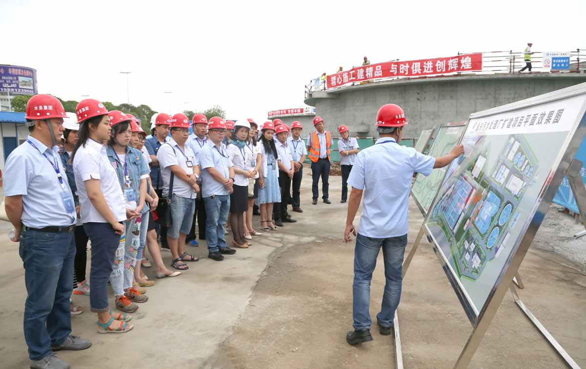 在京东方功能展示厅,工作人员介绍了工程总体情况,并现场操作展示了主要产品。在永兴污水处理厂扩建项目,严立伟和重点项目部副主任李军向与会人员介绍了项目建设的详细情况和建成意义。