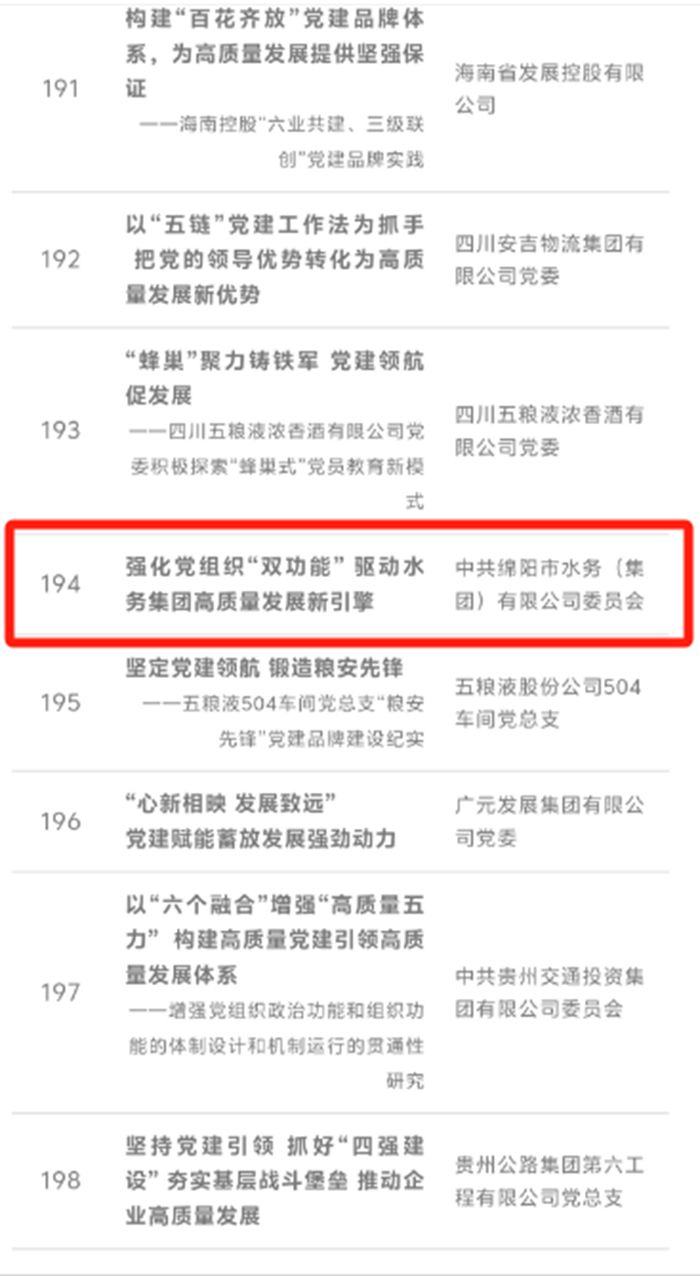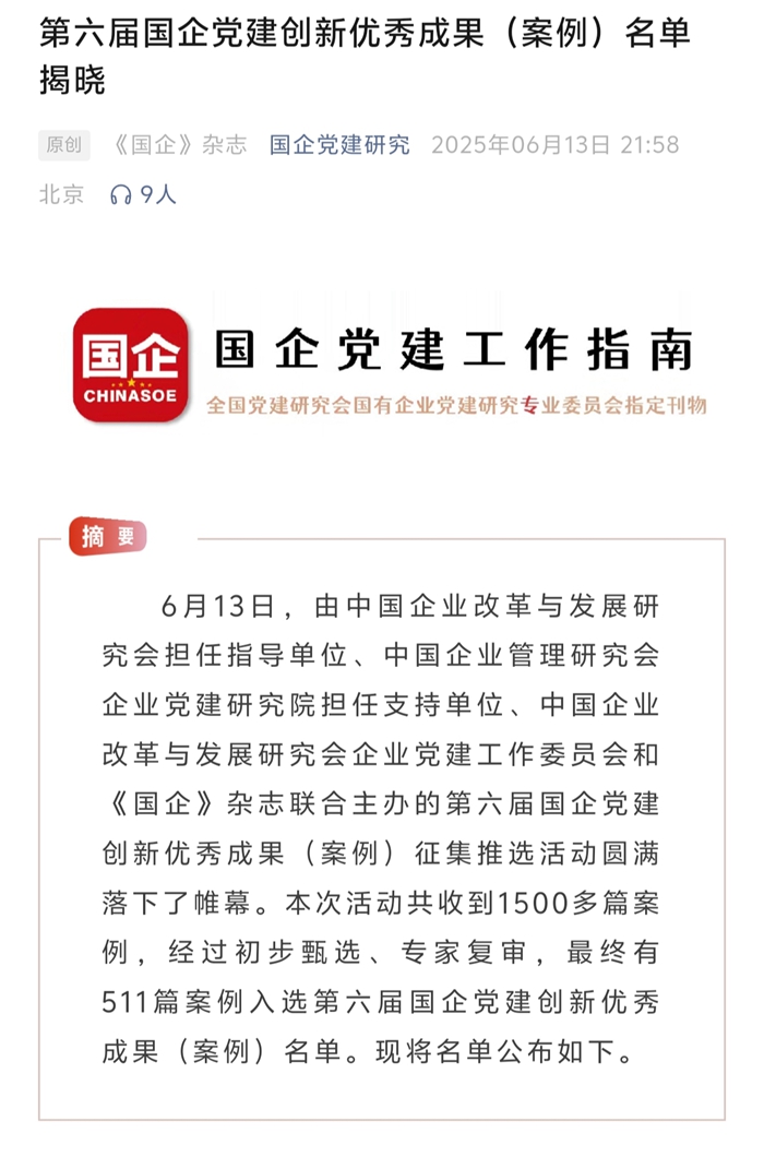 6月13日,第六届国企党建创新优秀成果(案例)名单揭晓,水务集团党委报送的《强化党组织“双功能” 驱动水务集团高质量发展新引擎》上榜。此次案例征集活动由中国企业改革与发展研究会担任指导单位、中国企业管理研究会企业党建研究院担任支持单位、中国企业改革与发展研究会企业党建工作委员会和《国企》杂志联合主办,共收到1500余篇案例,经过初步甄选、专家复审,最终有511篇案例入选。