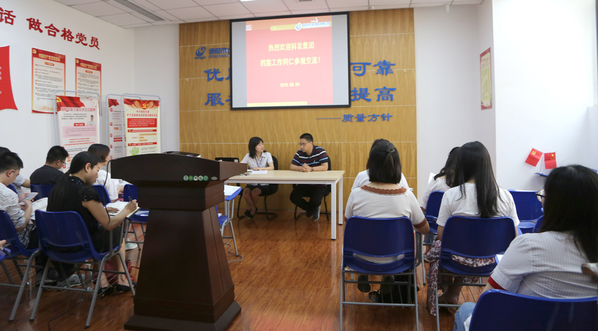 绵阳科技城发展投资(集团)有限公司系绵阳市工业投资平台,近年来,集团充分发挥科技城产业支撑平台的作用,实现跨越式发展。为解决其在快速发展的过程中档案管理滞后的问题,科发集团在得知我司档案管理基础扎实、尤其是在工程项目档案方面积累了丰富经验,6月4日下午,科发集团工程部分管副部长黄俊带队,组织工程部及下属高新建设开发公司、天达公司、通富公司、发达伟业公司相关人员一行13人赴我司交流学习。在客服中心培训室,公司行政管理部韩晓红经理、重点项目部档案负责人高瑾热情欢迎和接待了来访人员,行政管理部档案室以及高新供水公司、灵通公司、三江汇泽公司和各项目组档案管理人员10余人参会。