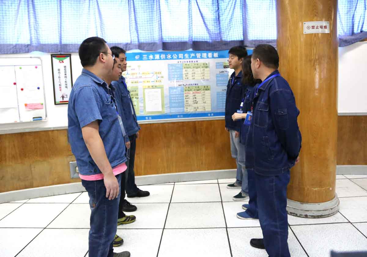 上午9点时整,在中控室,当天值班的运行班长刘洋,将班组成员的值班牌一一换上,并按照规定将从业证件上墙公示。9点15分,廖欢和班组的其他两名同事准时来到水厂中控制室,与担负前一天夜间值班任务的同事进行交接班。为确保供水生产的安全、正常,班长刘洋认真地和上一个班组交接值班情况,供水量多少、电耗多少、药耗多少、水质情况怎样……都要详细的交接。大家结合控制室里设置的管理看板,比较数据、分析情况,对当前自来水的生产、供应情况进行准确详细地了解。