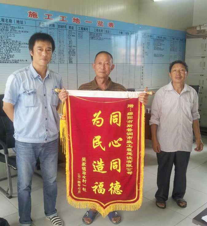 8月27日下午,吴家镇凉水村一队队长陈志贵、社员代表朱昌旭携一面写有“同心同德、为民造福”的鲜红锦旗,送到斯普润公司质安部。代表吴家镇凉水村一队全体社员,对斯普润公司高效率、高质量完成“村改居”户表改造工程的安装工作给予了高度地肯定,并对负责施工的王俊春班组表示感谢。