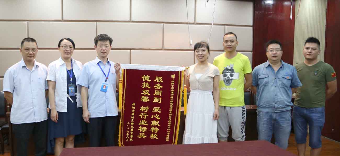 8月5日上午,绵阳市涪城区特殊教育学校工会主席以无比感激的心情,手捧一面塑有“服务周到,爱心献特校,德技双馨,树行业标兵”的锦旗,送到斯普润市政工程建设有限公司,以表达对该公司维护抢险中心优质、高效的维修服务的感谢。该公司副总经理韩青,第七党支部书记、工会主席谢涛,作为该公司代表进行接待。