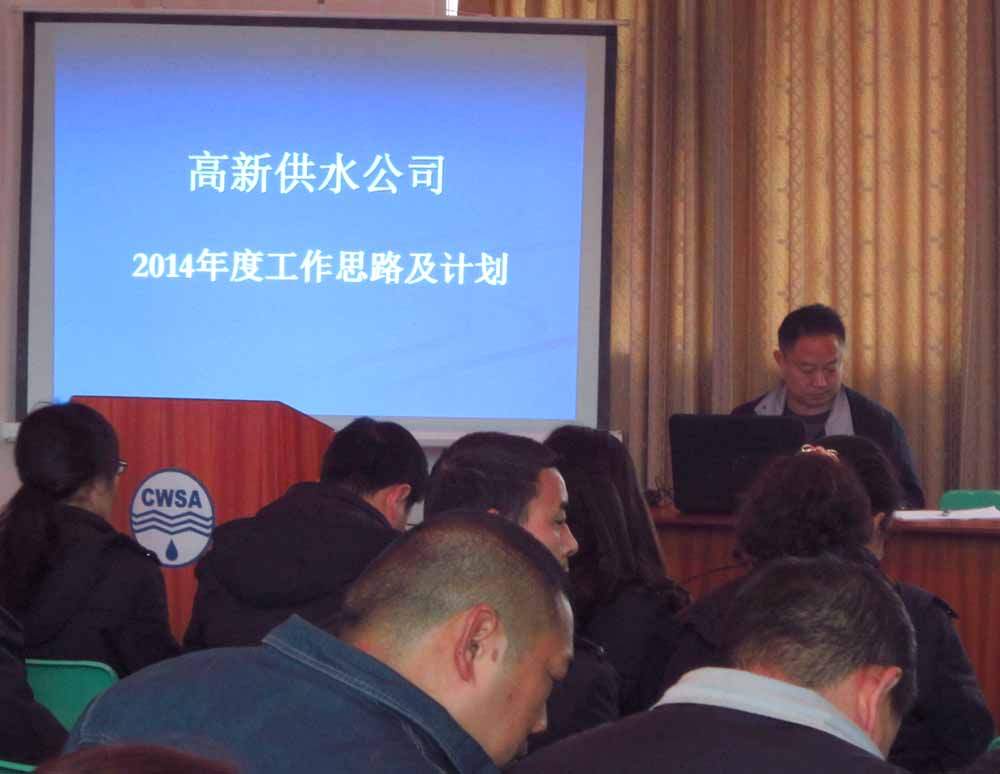 会上,该公司经理黄勇首先通报了《高新供水公司2014年度工作思路及计划》,对年度工作作出了以下部署:一是,供水总量再创新高。二是,利润总额要比上年度大幅增长。三是,产销差控制在12%以内。四是,完成菩提寺加压站前端旁通管道建设,利用园艺山补水管道压力差实现向新区直接供水,达到节能节电目的。五是,完成对现收费室的改建,努力改善供水服务条件。六是,完成河边镇老管